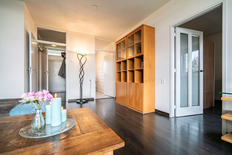 Vanuit de entree met meterkast, garderobe en badkamer is er toegang tot de woonkamer.
