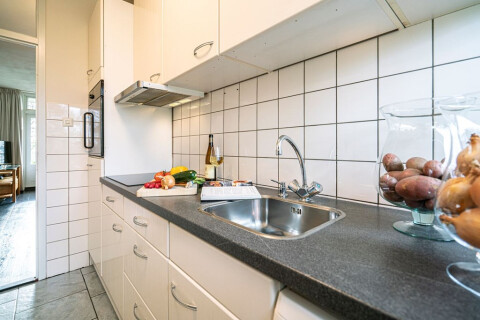 U treft er een 4 pits inductie kookplaat, koelkast, oven, afzuigkap. De witgoedaansluitingen bevinden zich tevens in de keuken. Bovenkastjes zorgen voor extra opbergmogelijkheden. Een royaal formaat raam zorgt voor prettige lichtinval.